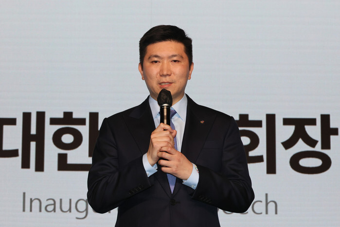 Korean Sport & Olympic Committee President Ryu Seung-min speaks during a ceremony at a hotel in Seoul on March 27, 2025, to mark his inauguration. (Yonhap)