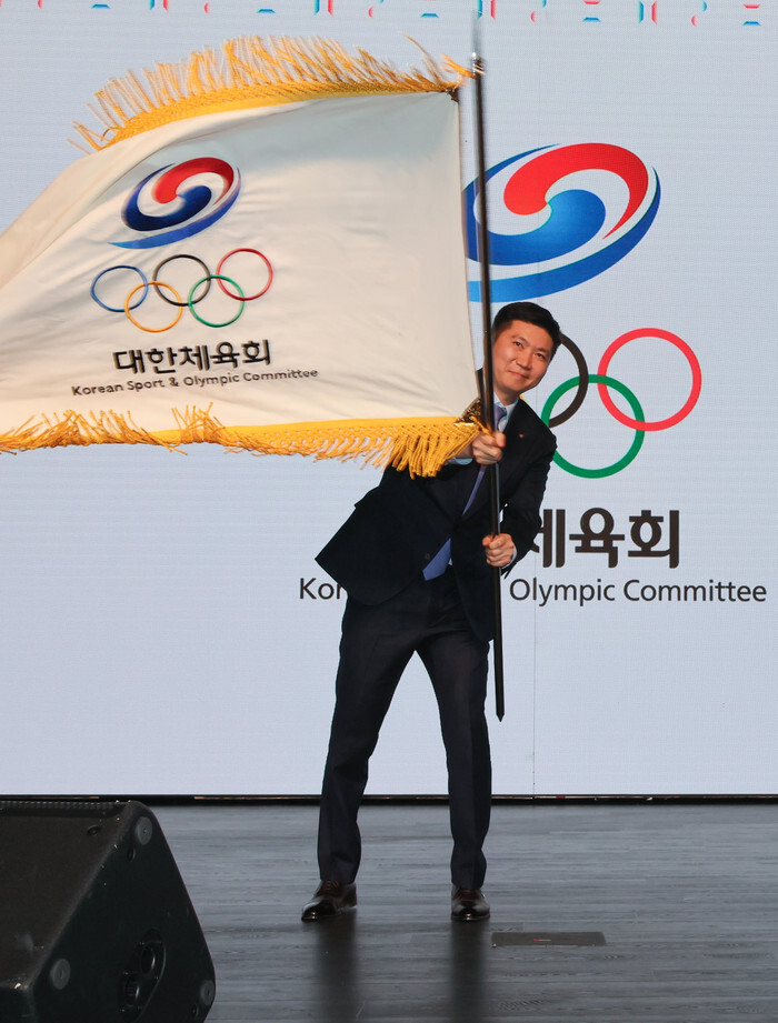 Korean Sport & Olympic Committee (KSOC) President Ryu Seung-min waves the KSOC flag during a ceremony at a hotel in Seoul on March 27, 2025, to mark his inauguration. (Yonhap)