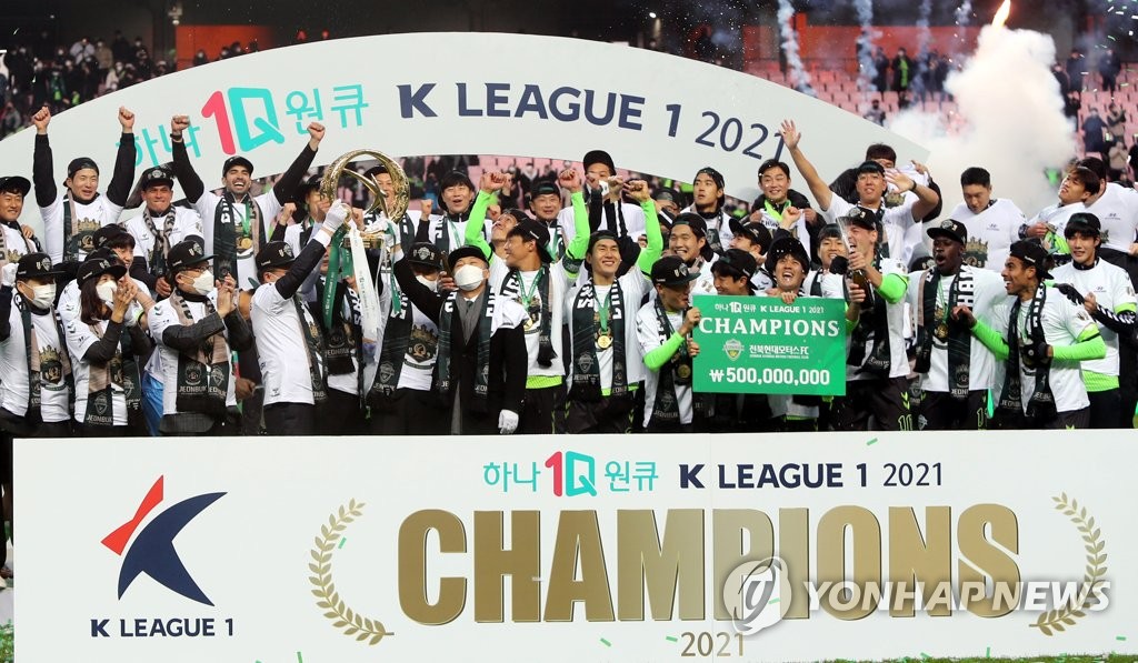 | ▲ Members of Jeonbuk Hyundai Motors celebrate their 2021 K League 1 championship following a 2-0 victory over Jeju United at Jeonju World Cup Stadium in Jeonju, some 240 kilometers south of Seoul, on Dec. 5, 2021. (Yonhap) |
