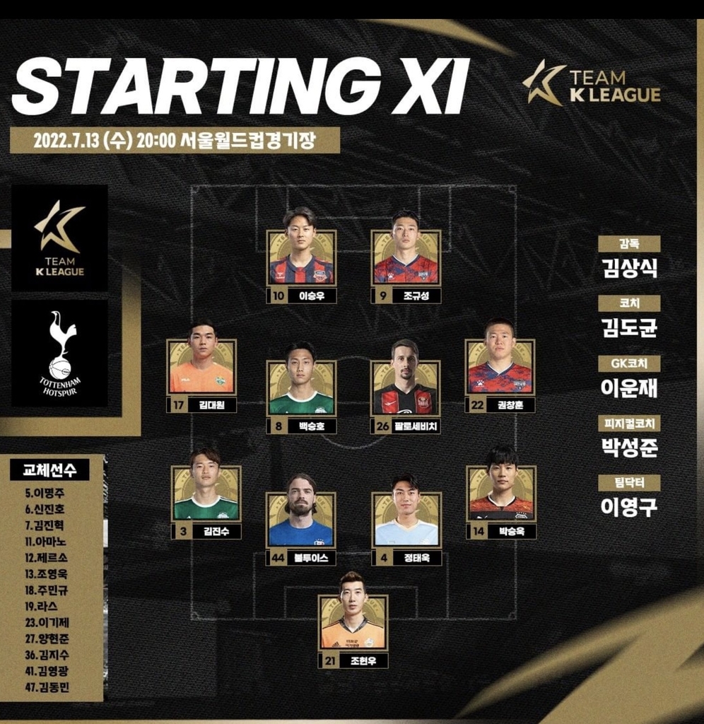 13일 오후 8시 서울월드컵경기장에서 치러질 잉글랜드 프로축구 토트넘과 K리그 선발팀 팀 K리그의 쿠팡플레이 시리즈 친선경기를 앞두고 공개된 선발 명단을 보면 손흥민과 케인은 교체 명단에 이름을 올렸다.
