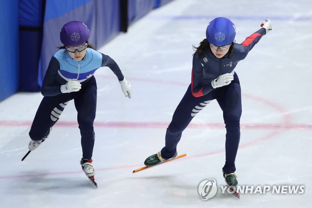 | ▲ In this file photo from Feb. 22, 2018, Choi Min-jeong of South Korea (L) falls after a collision with her teammate, Shim Suk-hee, during the women's 1,000m short track speed skating final at the PyeongChang Winter Olympics at Gangneung Ice Arena in Gangneung, 230 kilometers east of Seoul. (Yonhap) |