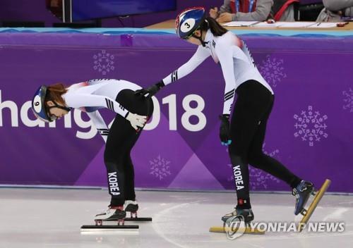 | ▲ In this file photo from Feb. 22, 2018, Shim Suk-hee of South Korea (R) consoles her teammate, Choi Min-jeong, after their collision during the women's 1,000m short track speed skating final at the PyeongChang Winter Olympics at Gangneung Ice Arena in Gangneung, 230 kilometers east of Seoul. (Yonhap) |