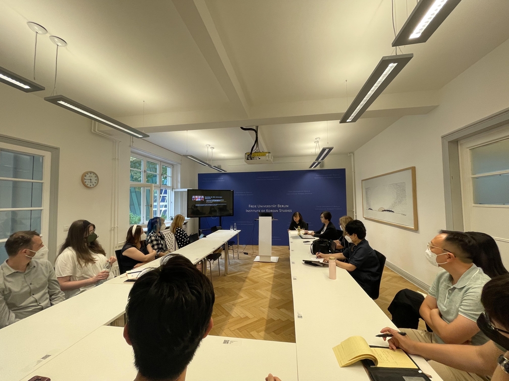 | ▲ 베를린자유대에서 강연하는 이나영 정의기억연대 이사장 (베를린=연합뉴스) 이율 특파원 = 이나영 정의기억연대 이사장이5일(현지시간) 베를린 자유대 한국학연구소에서 강연하고 있다. 2022.7.5 |
