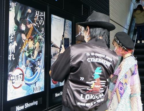 | ▲ 도쿄의 한 영화관 앞에서 일본 애니메이션 '귀멸의 칼날-무한열차편' 포스터를 촬영하는 행인들. (교도=연합뉴스 자료사진) |