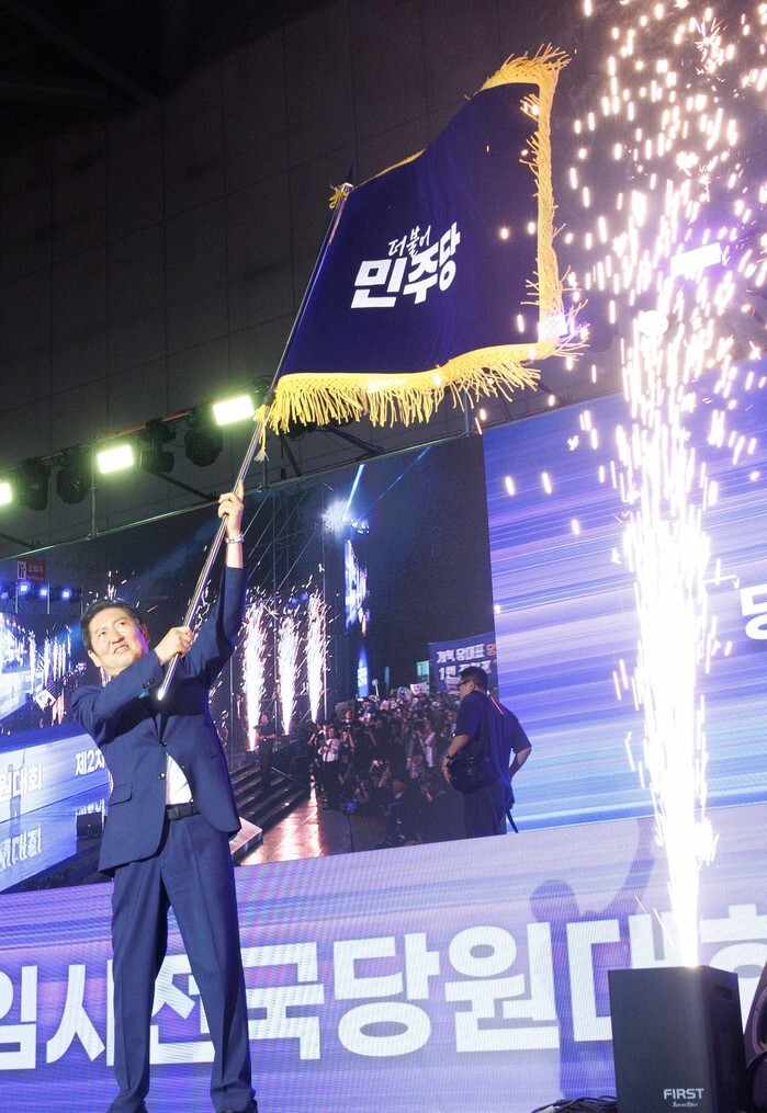 Jung Chung-rae, a four-term lawmaker of the ruling Democratic Party, waves a flag of the party, after being elected the party's new chairman at its national convention at the KINTEX exhibition center in Goyang, northwest of Seoul, on Aug. 2, 2025. (Pool photo) (Yonhap)
