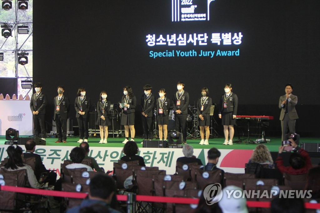 | ▲ 제7회 울주세계산악영화제 폐막 (울산=연합뉴스) 지난 1일 개막한 국내 유일의 국제 산악영화 축제 제7회 울주세계산악영화제가 10일 열흘간 일정은 마무리하고 폐막했다. 울산시 울주군 영남알프스 복합웰컴센터에서 열린 폐막식에서 울산지역 고등학생으로 구성된 심사단이 선정하는 청소년심사단 특별상 시상식이 진행되고 있다. 2022.4.10 [울주세계산악영화제 제공. 재판매 및 DB 금지] hkm@yna.co.kr |