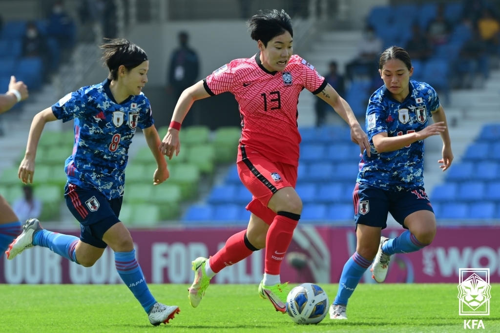 | ▲ Lee Geum-min of South Korea (C) dribbles between Hikaru Naomoto (L) and Fuka Nagano of Japan during the teams' Group C match at the Asian Football Confederation Women's Asian Cup at Shree Shiv Chhatrapati Sports Complex in Pune, India, on Jan. 27, 2022, in this photo provided by the Korea Football Association. (PHOTO NOT FOR SALE) (Yonhap) |