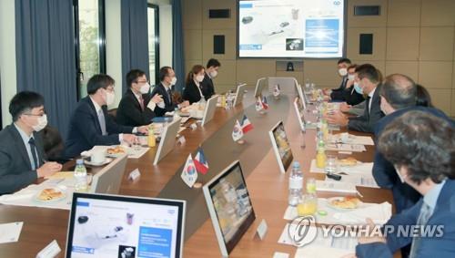 | ▲ This photo, provided by South Korea's Ministry of Trade, Industry and Energy, shows Trade Minister Yeo Han-koo (3rd from L) holding a meeting with officials of global auto parts producer Plastic Omnium in Paris on Oct. 5, 2021. (PHOTO NOT FOR SALE) (Yonhap) |