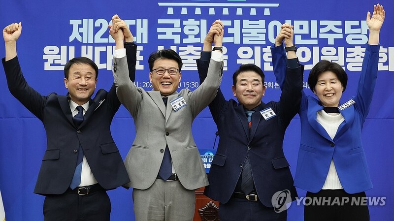 | ▲ Reps. Han Byung-do, Jin Sung-joon, Park Jeung and Back Hye-ryun (from L) pose for a photo at a Democratic Party lawmakers' meeting to elect a new floor leader at the National Assembly in Seoul on Jan. 11, 2026. (Yonhap) |