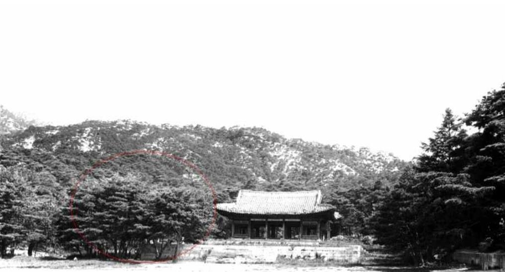 | ▲ 경복궁 융문당 전경 사진 융문당 주변에 반송으로 추정되는 수목(붉은 원)이 확인됨. [국립중앙박물관 제공. 재판매 및 DB 금지] |