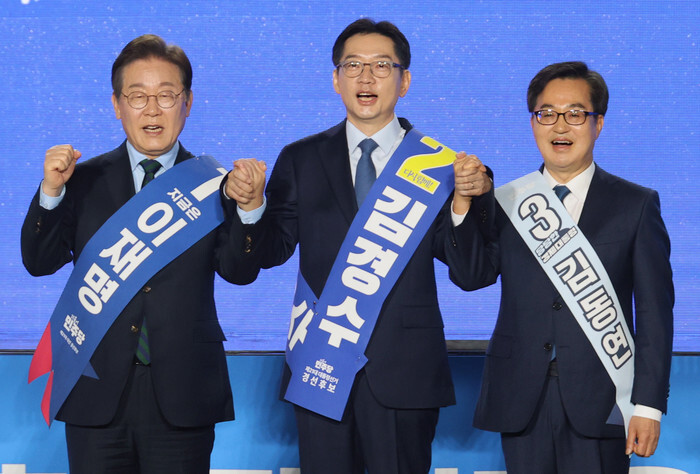 Former Democratic Party (DP) leader Lee Jae-myung (L), Kim Kyung-soo (C), a former South Gyeongsang Province governor, and Gyeonggi Province Gov. Kim Dong-yeon participate in the DP's primary in the central Chungcheong region on April 19, 2025, ahead of the June 3 presidential election. (Yonhap)
