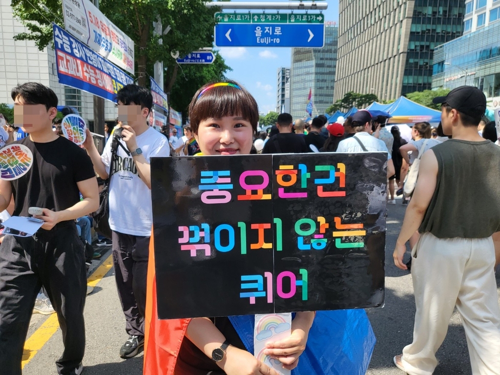 '중요한 건 꺾이지 않는 퀴어'라고 적힌 팻말을 들고 온 윤세나(33)씨는 "서울광장 사용이 불허돼 축제가 잘 열릴 수 있을까 걱정했는데 생각보다 괜찮은 것 같다. 한국사회에서 성소수자들이 성적 지향을 숨기며 살아가는데 이런 퍼레이드를 통해 자긍심과 자신감을 얻는다. 혼자가 아니라는 것을 깨달을 수 있다"며 활짝 웃었다.