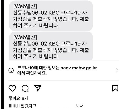 그는 SNS에 KBO가 보낸 자가 점검 요청 문자 메시지를 올리며 욕설했다.