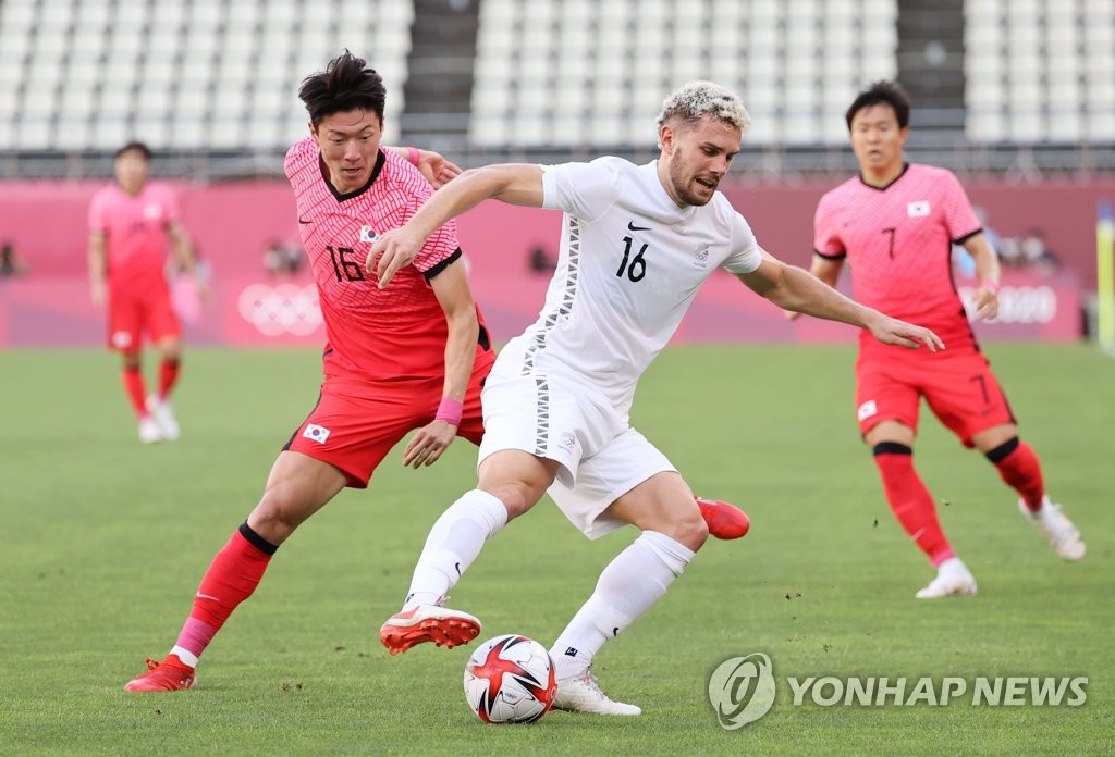 | ▲ Hwang Ui-jo of South Korea (L) battles Gianni Stensness of New Zealand during the teams' Group B match at the Tokyo Olympic men's football tournament at Ibaraki Kashima Stadium in Kashima, Japan, on July 22, 2021. (Yonhap) |