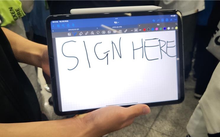 | ▲ 이정우, 김연조 학생이 사인을 받기 위해 준비한 아이패드 [촬영 설하은] |