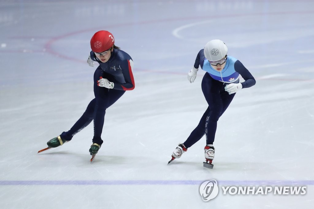| ▲ In this file photo from March 19, 2021, South Korean short track speed skaters Shim Suk-hee (L) and Choi Min-jeong compete in the women's 1,000m final at the 36th Korea Skating Union President's Cup at Uijeongbu Indoor Skating Arena in Uijeongbu, Gyeonggi Province. (Yonhap) |