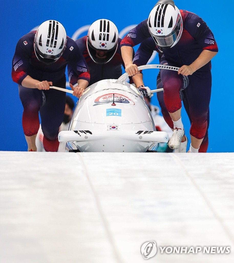 | ▲ A South Korean bobsleigh team led by pilot Won Yun-jong (R) starts the first run of the four-man competition at the Beijing Winter Olympics at Yanqing National Sliding Centre in Yanqing, northwestern Beijing, on Feb. 19, 2022. (Yonhap) |