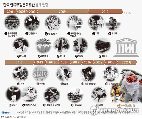| ▲ [그래픽] 한국 인류무형문화유산 등재 현황 (서울=연합뉴스) 김민지 기자 = 유네스코 무형유산보호협약 정부 간 위원회(무형유산위원회)는 30일(현지시간) 모로코 라바트에서 열린 회의에서 탈춤을 인류무형문화유산 대표목록에 등재하기로 결정했다.