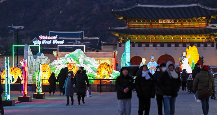 Visitors stroll among lanterns that have been lit up at Gwanghwamun Square in central Seoul on Dec. 18, 2022, a day ahead of the official opening of the Seoul Light-Gwanghwa 2022 illumination festival. (Yonhap)