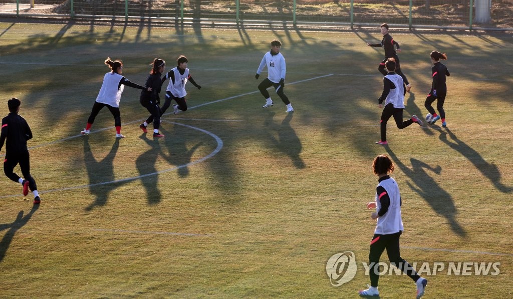 | ▲ Members of the South Korean women's national football team train at Gangjin Sports Complex in Gangjin, 410 kilometers south of Seoul, on Jan. 19, 2021, in preparation for Olympic qualifying matches against China. (Yonhap) |