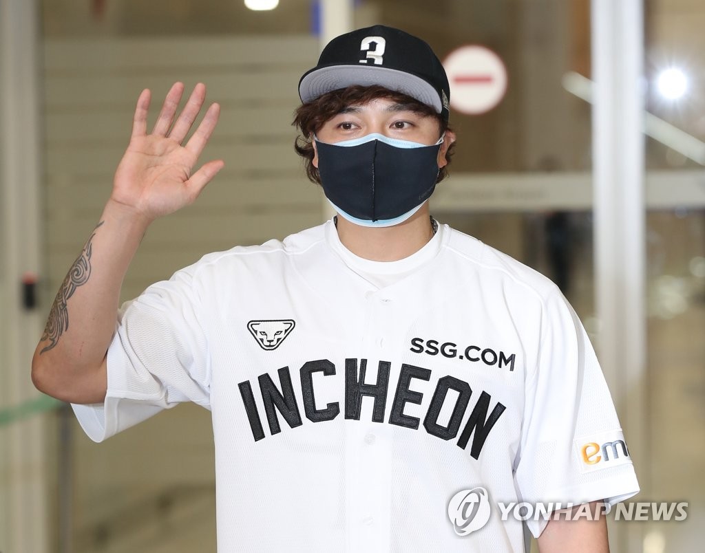 | ▲ Choo Shin-soo of the Korea Baseball Organization club owned by Shinsegae Group poses in his new club's temporary jersey after arriving at Incheon International Airport in Incheon, just west of Seoul, on Feb. 25, 2021. (Yonhap) |
