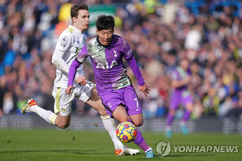 | ▲ In this AFP photo, Son Heung-min of Tottenham Hotspur (R) is in action against Leeds United during a Premier League match at Elland Road in Leeds, England, on Feb. 26, 2022. (Yonhap) |