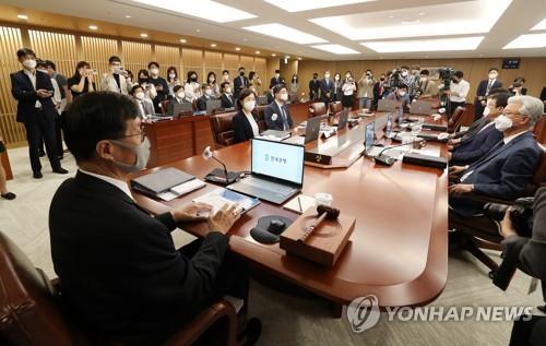 | ▲ This file photo taken May 26, 2022, shows Bank of Korea (BOK) Gov. Rhee Chang-yong (L) and the members of the BOK's monetary policy board attending a meeting in Seoul. (Yonhap) |