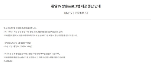 지니TV는 또 "관계 법령을 준수하고 방송 사업자의 책무를 충실히 이행하며, 고객님께 더 좋은 방송 서비스를 제공할 수 있도록 최선의 노력을 다하겠다"고 알렸다. KT 홈페이지에도 같은 내용의 공지가 올라왔다.