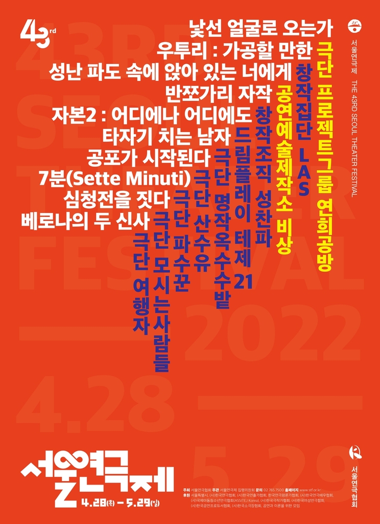 (서울=연합뉴스) 임동근 기자 = 제43회 서울연극제가 오는 28일부터 다음 달 29일까지 대학로예술극장, 아트원씨어터, 알과핵 소극장, 씨어터 쿰 등 대학로 일대 공연장에서 개최된다.