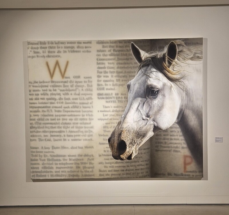 (남양주=연합뉴스) 김경윤 기자 = 휘날리는 갈기, 촉촉한 눈망울의 말이 마치 고해상도 사진처럼 생생하게 묘사된 하이퍼리얼리즘(극사실주의) 그림 뒤로 활자가 빼곡한 책 또는 거대한 시곗바늘이 자리한다.