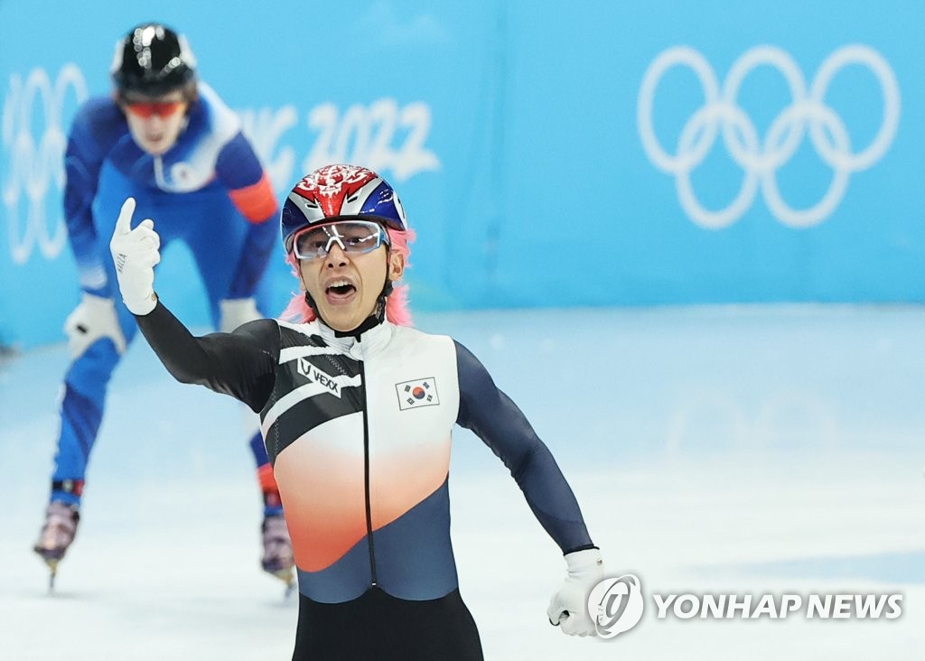 ▲ Kwak Yoon-gy of South Korea celebrates his team's victory in the men's 5,000m relay semifinal heat in short track speed skating during the Beijing Winter Olympics at Capital Indoor Stadium in Beijing on Feb. 11, 2022. (Yonhap)