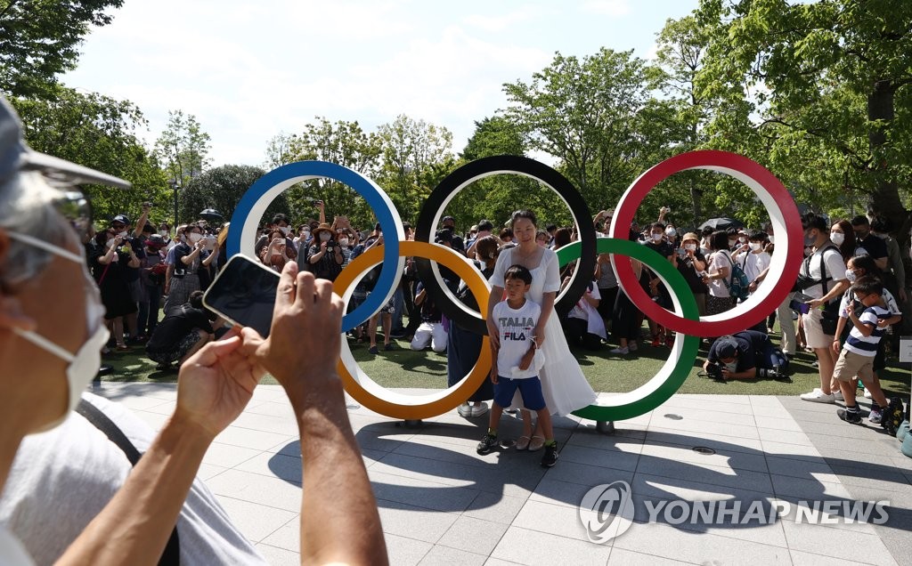 | ▲ People take pictures with the Olympic Rings set up outside the National Stadium in Tokyo before the opening ceremony for the Tokyo Olympics on July 23, 2021. (Yonhap) |