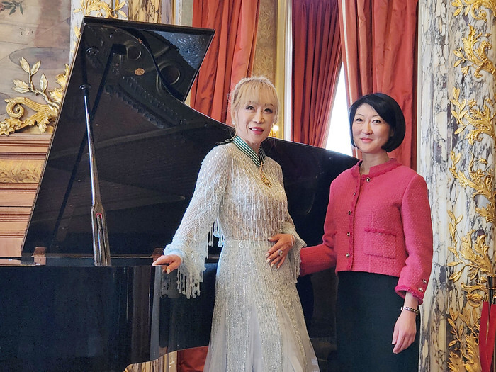 South Korea's renowned soprano Sumi Jo (L) poses for a photo with former French Culture Minister Fleur Pellerin after receiving France's Commandeur of the Order of Arts and Letters, the highest rank of the three-tier honor bestowed by the French Ministry of Culture, at the Opera-Comique in Paris on May 26, 2025, in recognition of her contributions to French art. (Yonhap)