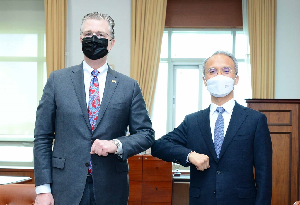 | ▲ Daniel Kritenbrink (D), the U.S. assistant secretary of state for East Asian and Pacific affairs, bumps elbows with his South Korean counterpart, Yeo Seung-bae, a deputy minister for political affairs, on Nov. 11, 2021, during their meeting in Seoul in this photo provided by the Ministry of Foreign Affairs. (PHOTO NOT FOR SALE) (Yonhap) |