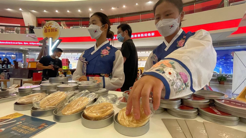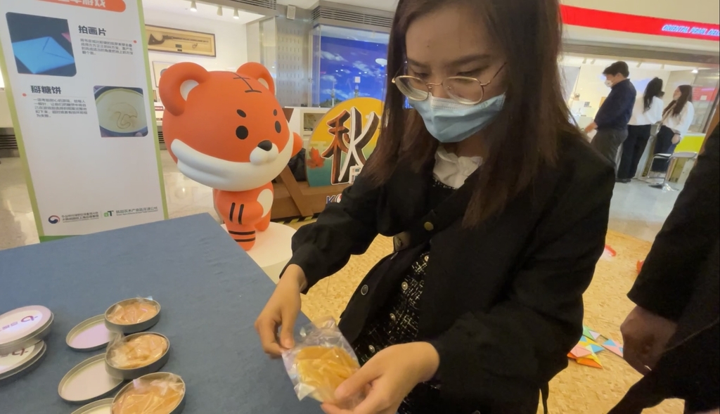 이곳에서는 중국인 관람객들이 세계적으로 인기를 끌고 있는 드라마 '오징어 게임'에 나와 유명해진 한국식 설탕 과자 '달고나'를 붙잡고 조심스럽게 찍힌 모양대로 떼어내고 있었다.