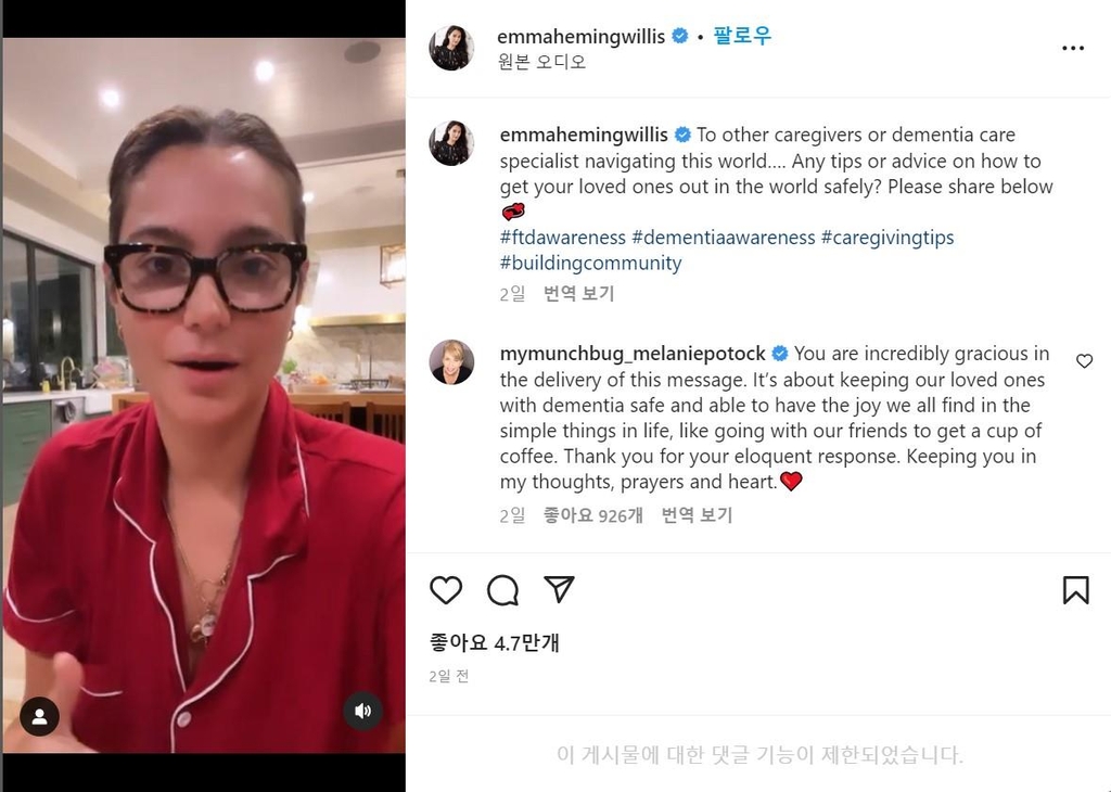 앞서 지난달 16일(현지시간) 윌리스 가족은 그가 전두측두엽 치매(FTD) 진단을 받았다고 밝혔다. 지난해 3월 윌리스가 실어증에 따른 인지 능력 저하로 할리우드 영화계에서 은퇴한 뒤 거의 1년 만에 나온 발표였다.
