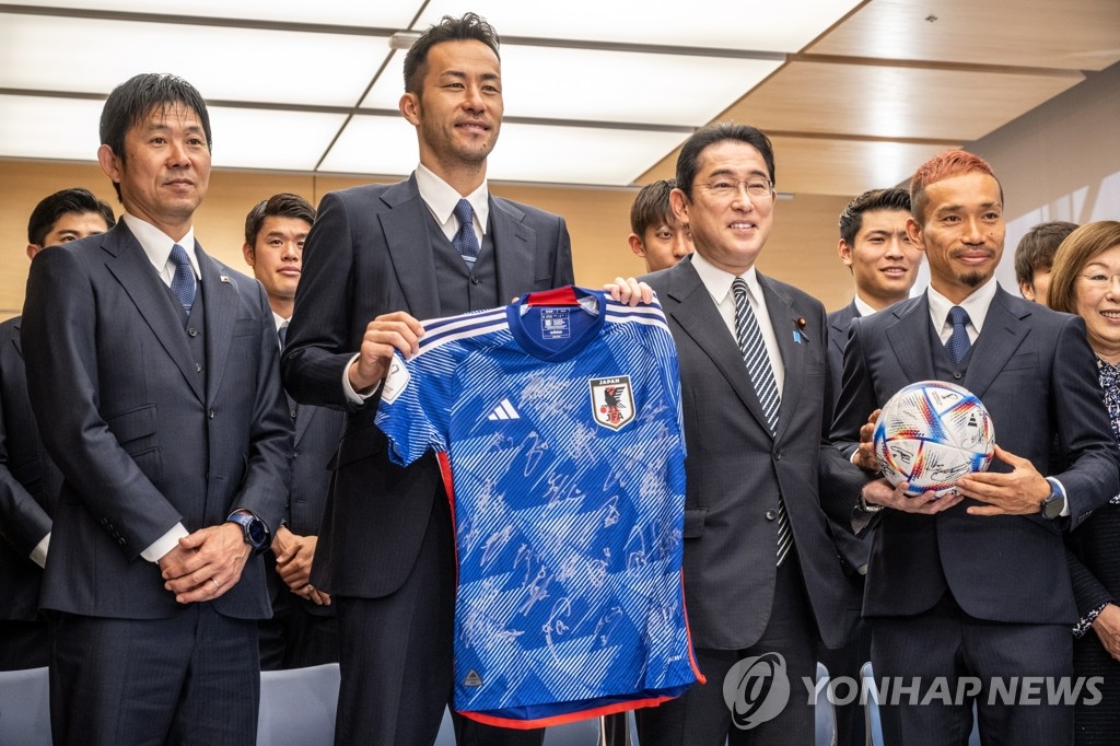 | ▲ 기시다 총리와 사진 촬영하는 일본 축구대표팀 (도쿄 EPA=연합뉴스) 일본 축구 국가대표팀 선수들과 모리야스 하지메 감독(왼쪽에서 첫번째)이 8일 도쿄 총리실에서 기시다 후미오 총리와 면담하기에 앞서 기념품을 든 채 기시다 총리(오른쪽에서 두번째)와 사진을 찍고 있다. 일본은 2022 카타르 월드컵에서 16강에 진출했으나 크로아티아에 져 8강에 오르지는 못했다. 2022.12.08 ddy04002@yna.co.kr |
