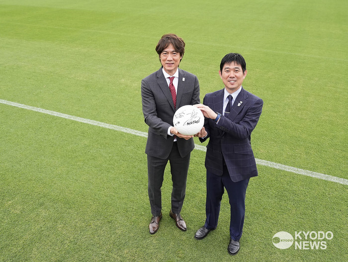 South Korean national football team head coach Hong Myung-bo (L) and Japan's head coach Hajime Moriyasu pose for a commemorative photo during a special talk on June 26, 2025, at the Japan Football Association Dream Field in Chiba Prefecture, Japan, to mark the 60th anniversary of diplomatic relations between the two countries, in this photo released by Kyodo News on July 5. (PHOTO NOT FOR SALE) (Yonhap)