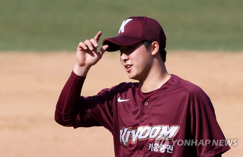 | ▲ In this file photo from March 28, 2021, Jang Jae-young of the Kiwoom Heroes reacts after picking up a save against the Kia Tigers in a Korea Baseball Organization preseason game at Gwangju-Kia Champions Field in Gwangju, 330 kilometers south of Seoul. (Yonhap) |