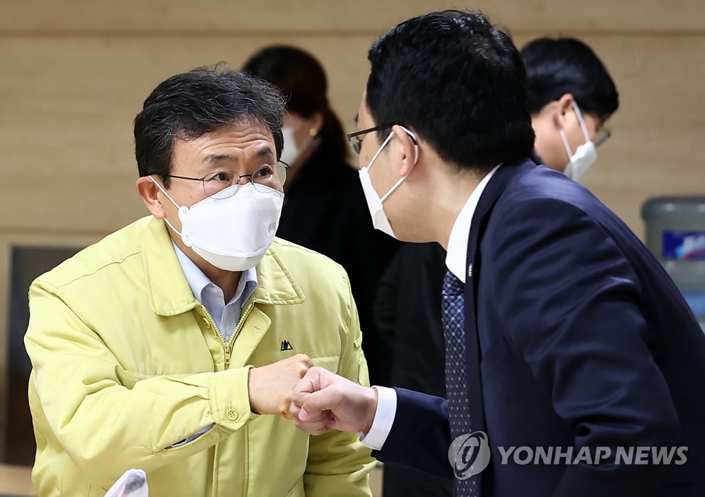 | ▲ Health Minister Kwon Deok-cheol (L) bumps fists with Choi Dae-zip, head of the Korean Medical Association, before a meeting over COVID-19 vaccination held in Seoul on Feb. 21, 2021. (Yonhap) |