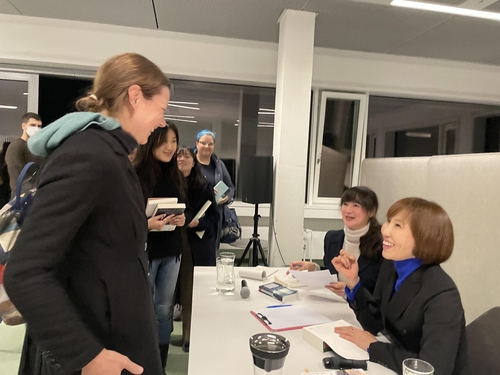 | ▲ 독일 독자들과 만난 정유정 작가 (베를린=연합뉴스) 이율 특파원 = 독일 베를린자유대 도서관에서 열린 종의 기원 낭독회 후 정유정 작가가 독자들과 만나 작품에 사인하고 있다. 2022.11.14 |