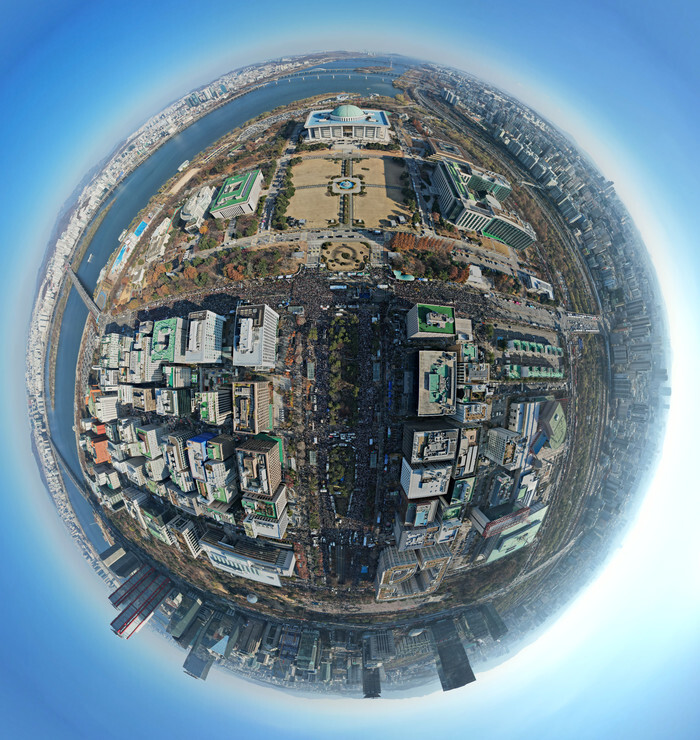 This edited image, taken with a drone, shows protesters supporting the impeachment of President Yoon Suk Yeol gathering near the National Assembly in central Seoul on Dec. 14, 2024. (Yonhap)