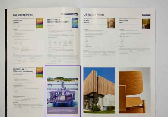 영문으로 제작된 소책자에는 퍼플교 사진과 세계 최우수 관광마을에 자사 페인트가 사용되었다는 내용이 실렸다.