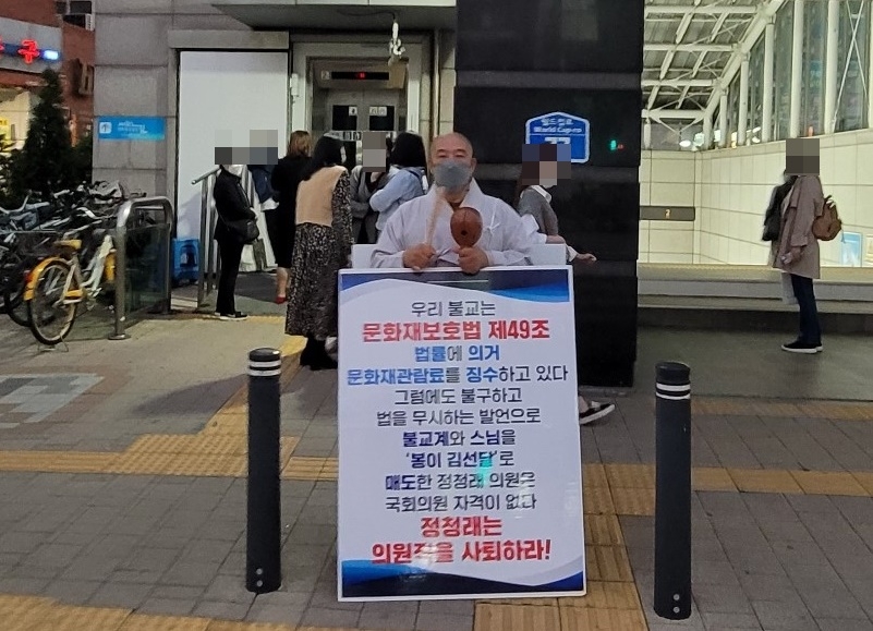 조계종 총무원 문화부장 성공스님은 이날 서울 마포구 서교동에 있는 정 의원 지역구 사무소 앞에서 피켓을 몸 앞뒤로 두른 채 목탁을 두드리며 1인 시위를 벌였다.