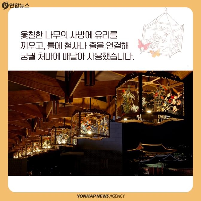 옻칠한 나무의 사방에 유리를 끼우고, 틀에 철사나 줄을 연결해 궁궐 처마에 매달아 사용했습니다.