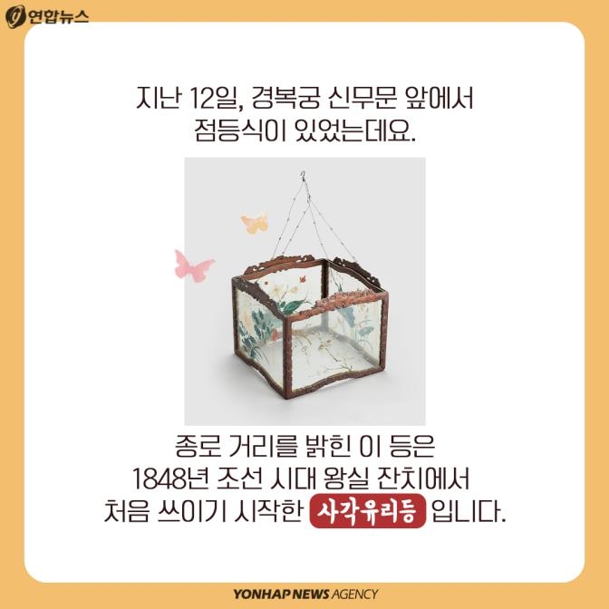 종로 거리를 밝힌 이 등은 1848년 조선 시대 왕실 잔치에서 처음 쓰이기 시작한 사각유리등입니다.