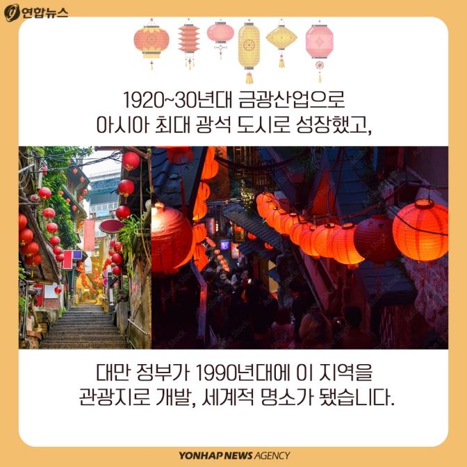 영화 '센과 치히로의 행방불명'의 배경지를 연상케 하는 이 '빛의 도시'는 아홉 가구밖에 없던 작은 산골 마을이었는데 1920~30년대 금광산업으로 아시아 최대 광석 도시로 성장했고, 대만 정부가 1990년대에 이 지역을 관광지로 개발, 세계적 명소가 됐습니다.