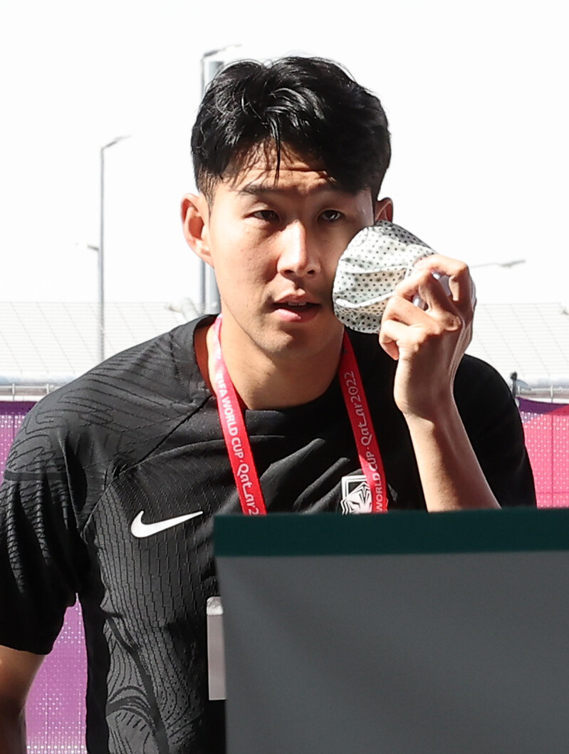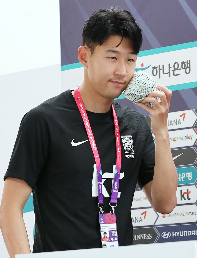South Korean captain Son Heung-min ices his face before a press conference following a training session for the FIFA World Cup at Al Egla Training Facility in Doha on Nov. 16, 2022. (Yonhap)