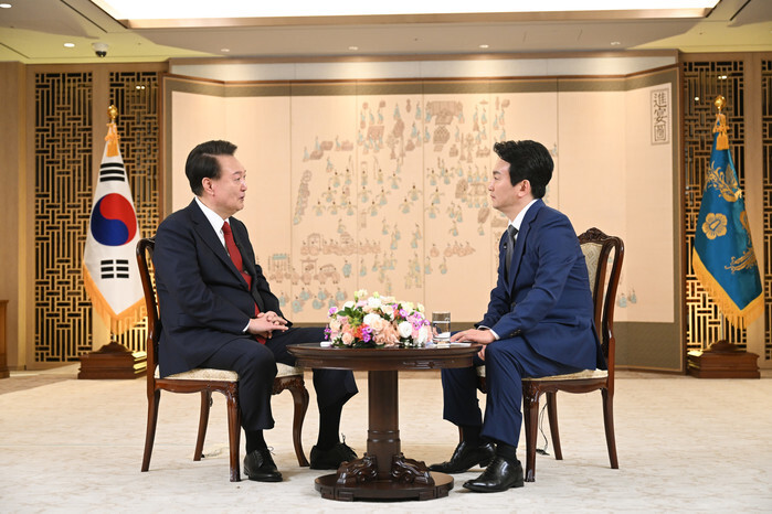 President Yoon Suk Yeol (L) speaks during a special interview with state-run broadcaster KBS at the presidential office in Seoul on Feb. 4, 2024, in this photo provided by the office. (PHOTO NOT FOR SALE) (Yonhap)