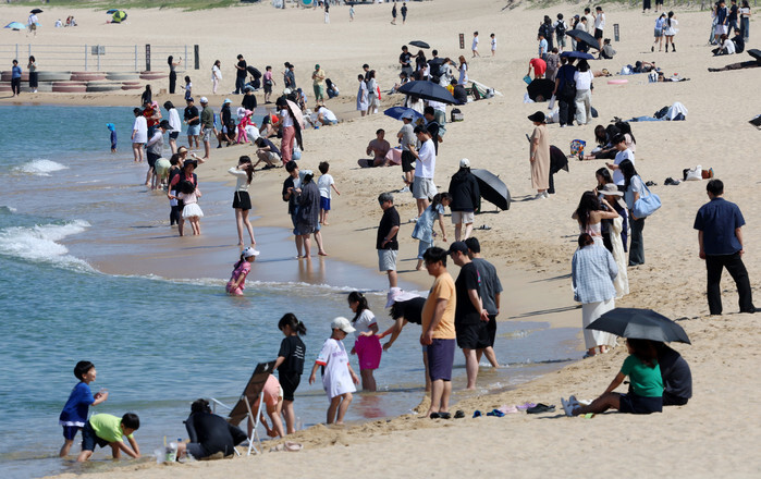 This photo, taken June 22, 2025, shows summer vacationers seeking to cool down amid sweltering heat at a beach in Gangneung, some 170 kilometers east of Seoul. (Yonhap)